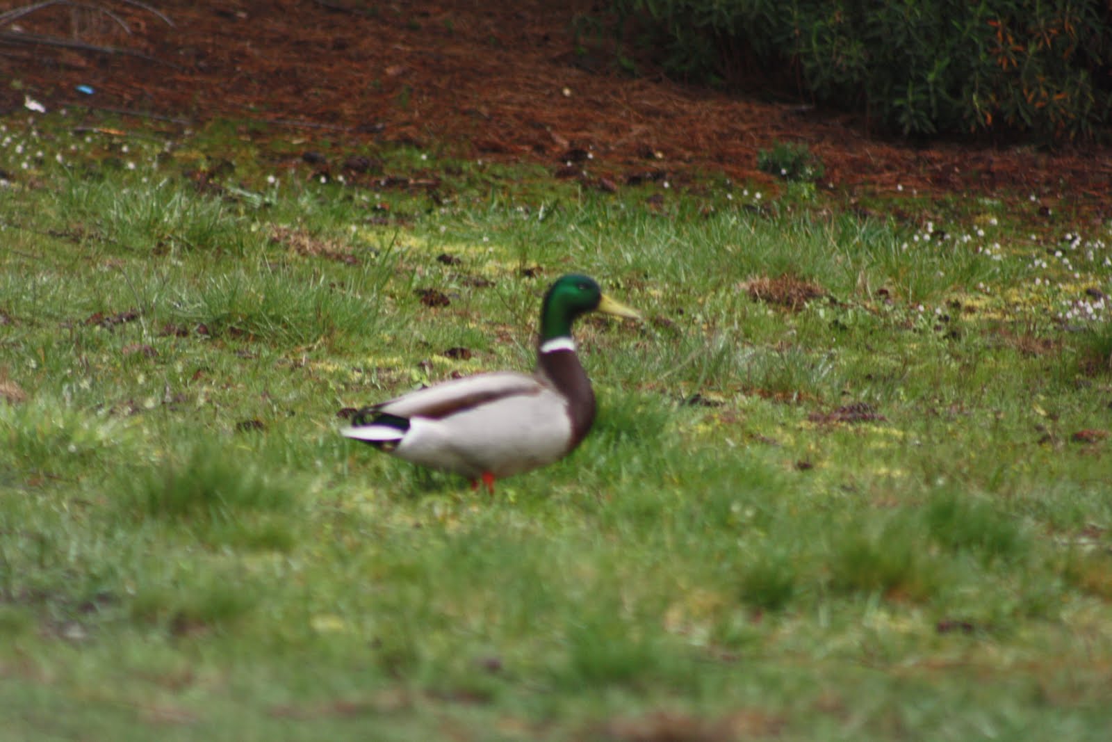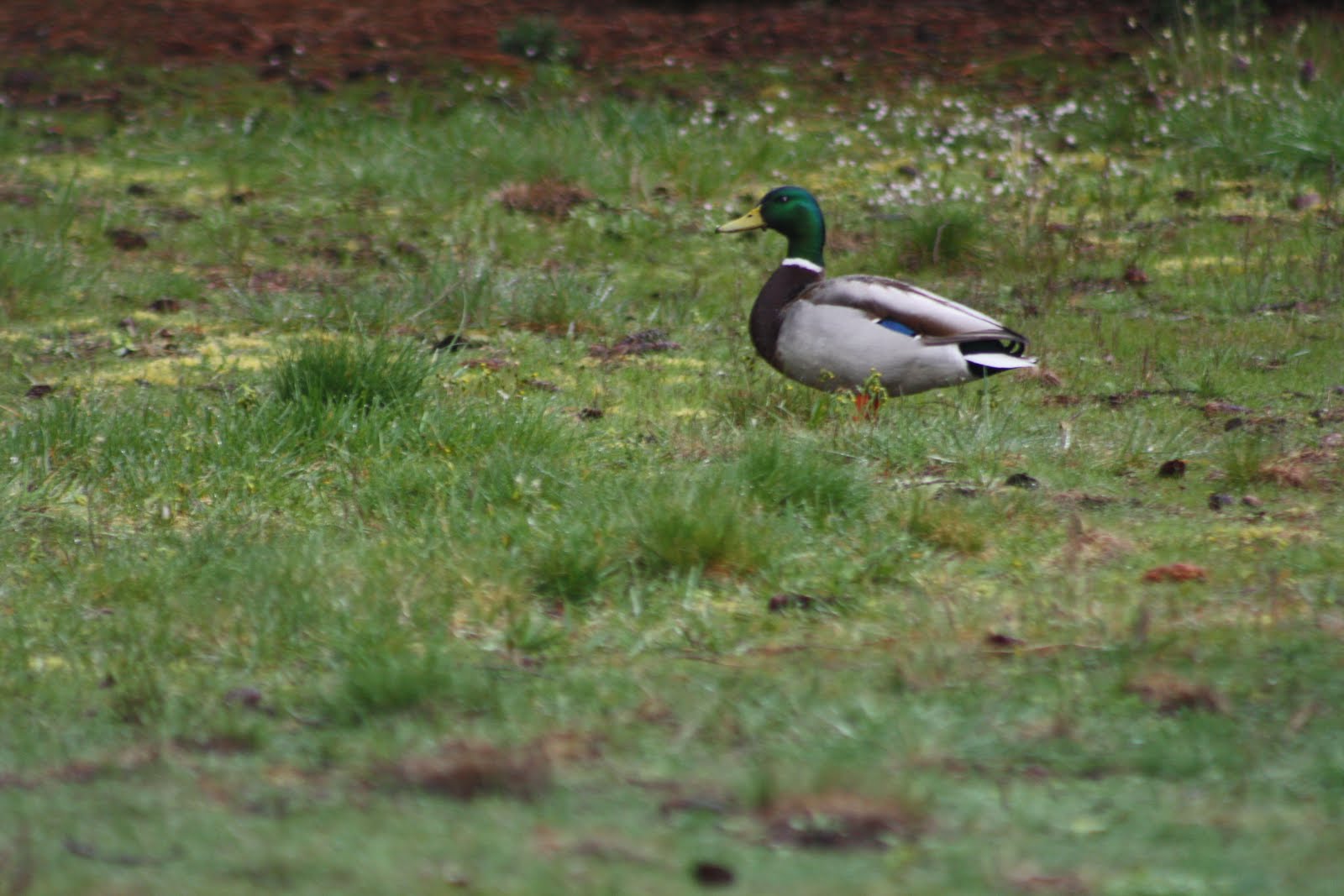 This morning held another surprise visitor… a male mallard duck dropped in for a visit. He stayed about a half hour before he flew off to the next grazing place.